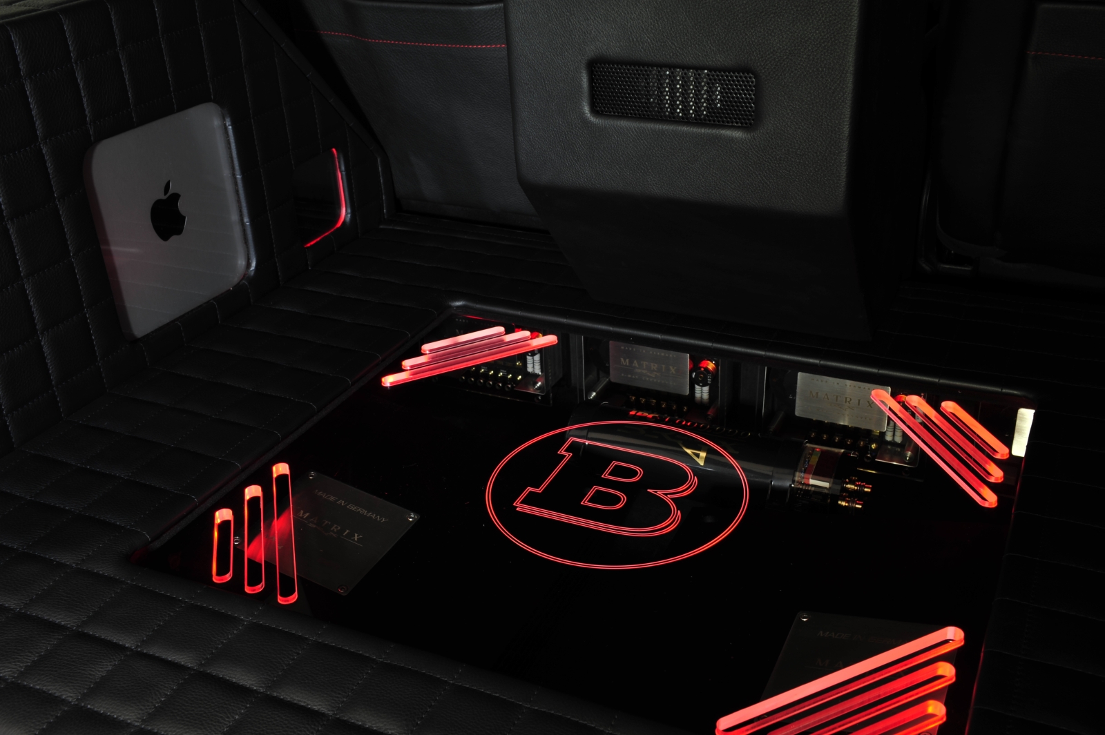 A mennyezetből nyitható le a 15,6 hüvelykes LCD monitor, amely a multimédiás rendszer fő képernyőjeként funkcionál. A beépített iPad Mini és Mac Mini mainframe számítógéppel pontosan úgy lehet dolgozni, mint az irodában vagy otthon. Az internet-kapcsolat nagysebességű modemen és WLAN hálózaton keresztül jön létre. Az iPad táblagépet integrálták az autó elektronikájába, így vezérelhető vele a rendszer legtöbb funkciója. Lehet internet tévét és DVD filmeket is nézni, a fedélzeti iPod Touch pedig több mint 14 ezer zeneszám tárolására képes. Mindezt pedig igazán pazar környezetbe ültették. A G-osztály minden négyzetcentiméterét puha, lélegző Mastik bőrrel húztak be, a mennyezetet pedig fekete Alcantarával borították. Az előkelő megjelenést gyémántmintás varrás biztosítja.