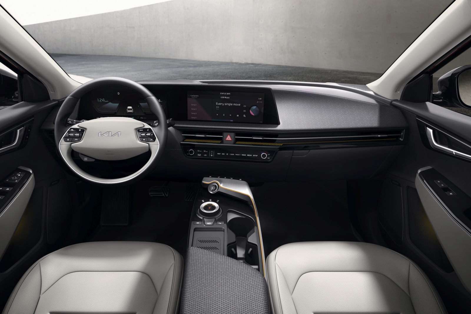 Az utastér formáin dolgozók munkáját nagyban megkönnyítette, hogy az E-GMP platform a korábbi padlólemezeknél jóval több lehetőséget kínál, és szabadabb kezet, több mozgásteret is enged a formatervezőknek. Az utastér egyik legfeltűnőbb és legkülönlegesebb eleme a nagyméretű, ívelt és egybefüggő audiovizuális és navigációs képernyő. A széles, íves képernyő egyszerű és letisztult formája különös tágasságérzetet sugall. A kijelző vezető előtti részén a főműszerek információi jelennek meg, a középkonzol vonalában pedig az infotainment és a navigáció. A kijelző méreteiből adódóan a vezetőt körülöleli az információ, miközben a kevés hagyományos kapcsoló tovább hangsúlyozza a beltéri letisztultságot.