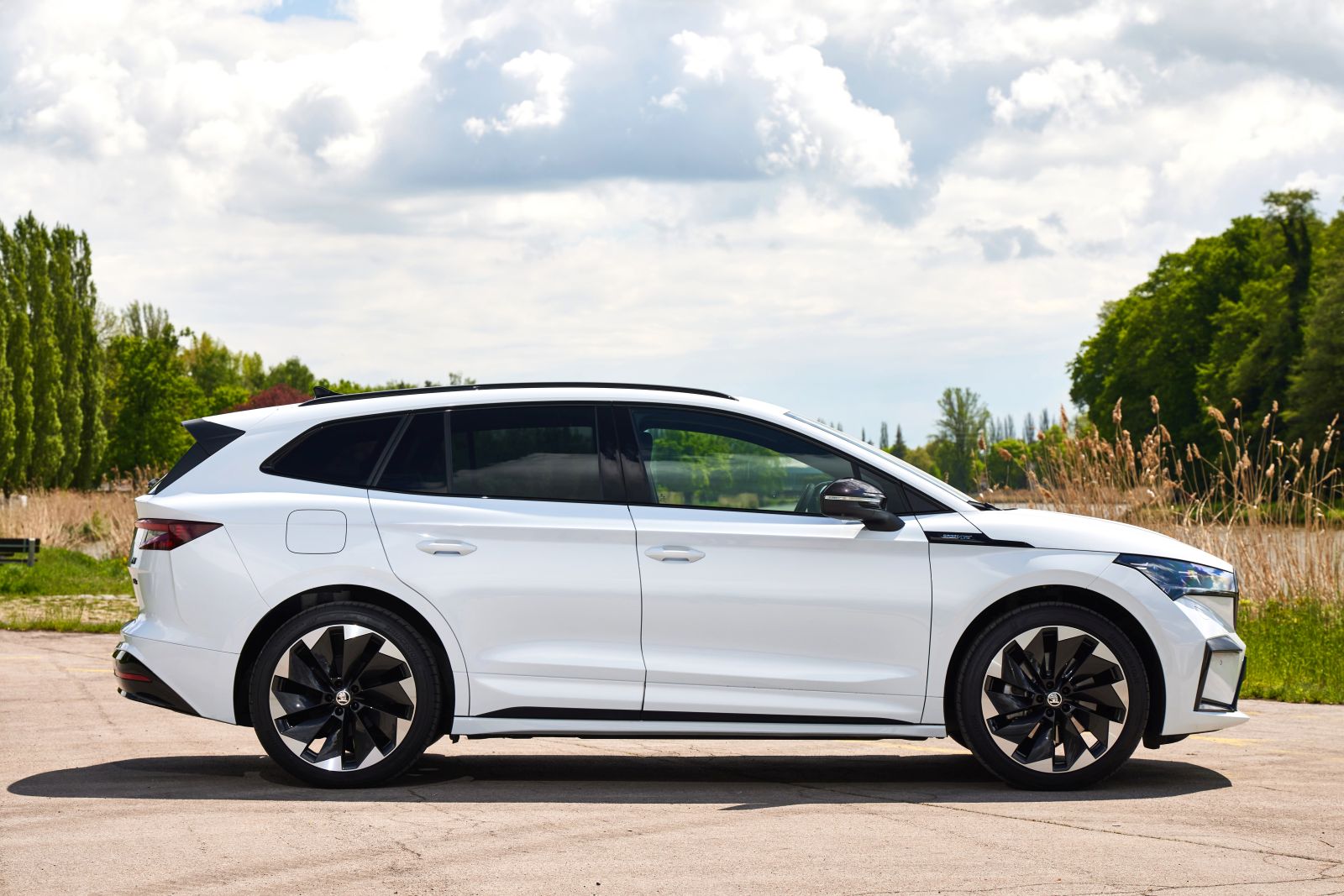 Az Enyaq Sportline iV dinamikus megjelenését az aerodinamikailag optimalizált kialakítású, nagyméretű könnyűfém keréktárcsái is hangsúlyozzák. Az antracitárnyalatú Vega keréktárcsák peremátmérője 20 col, a 21 colos Betria szett pedig fekete fényezéssel rendelhető. A gumiabroncsok esetében az öntömítő SEAL-technológiát alkalmazták. A sötétített hátsó szélvédő és hátsó oldalablakok szintén a sportos megjelenést emelik ki.