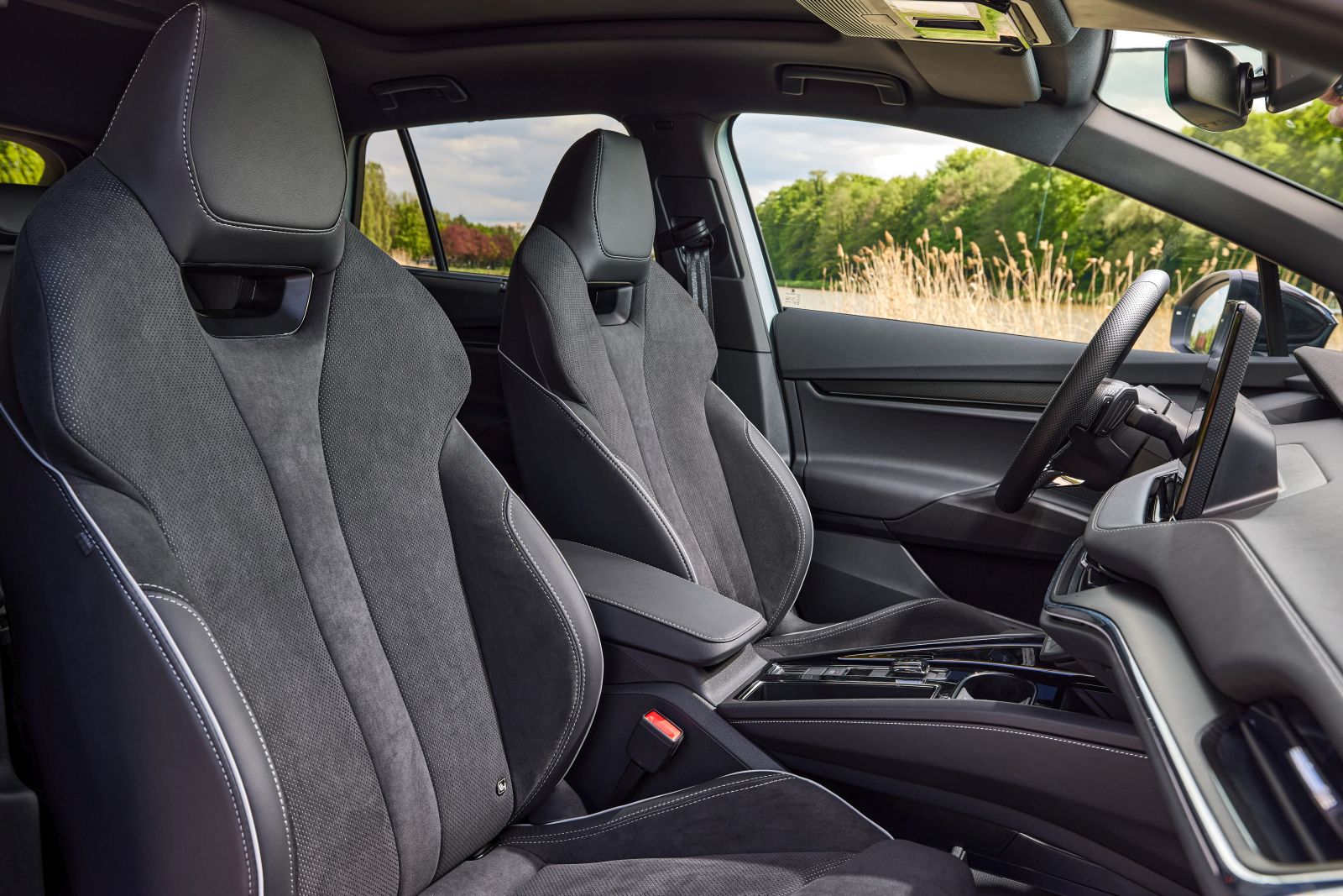 Fekete kárpitok és szénszál erősítésű műanyag (karbon) hatású dekorsávok határozzák meg az Enyaq Sportline iV utasterének stílusát. A modellben olyan Design Selection összeállítások váltják fel a hagyományos felszereltségi szinteket, amelyek a modern lakókörnyezeteket idézik, miközben összehangolt színeket és anyagokat kínálnak. A Sportline változat modellspecifikus Design Selection összeállításában integrált fejtámlákkal kiformált, fekete sportülések gondoskodnak optimális oldaltartásról. Az üléseket Suedia mikroszálas szövet és bőr borítja, szürke szegélyekkel kiegészítve, míg a textil lábszőnyegek szürke nubukkal steppeltek. A műszerfalat fekete műbőrbevonat borítja, s a mennyezetkárpit is fekete. A műszerfal és az ajtókárpitok dekorbetétjei karbon hatásúak. A középkonzolon a sebességváltó kisméretű billenőkapcsolójának környezete éppúgy feketén fénylik, mint az elektromos rögzítőfék gombja. Az alumínium pedálborítások szintén sportos stílusjegyek.